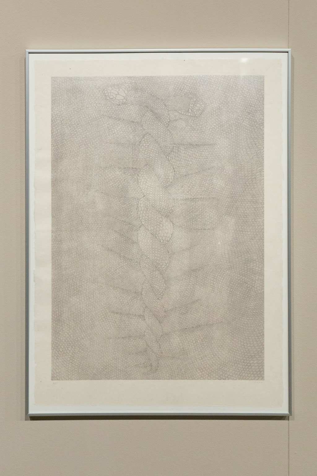 Tot això ho hem vist a les obres de la mostra, a les vuit entortolligades serps dels aiguaforts i a les altres: Les mans, Cercle, Rastre, El jardí de la poma, Nusos, Mirall, Eina, Mont, Esfera d’espines, Natura morta, El cel es fon a la vall, Llamp, Bosc i Camí. Aquesta peça, Camí, de l’any 2012, és la més antiga. És un collage en un dibuix sobre paper, d’una pell de serp. L’artista va topar-se fa anys amb una serp morta a la carretera, va recollir l’animal que tenia el cap molt malmès per l’atropellament i va obrir-li el ventre en tota la seva llargada per llevar-li la pell. Després aquesta pell la va sotmetre a un procés d’adobatge i assecat per poder-la conservar i utilitzar en alguna obra que aleshores desconeixia en què consistiria. Aquesta obra seria Camí, la primera i predecessora de totes les altres.