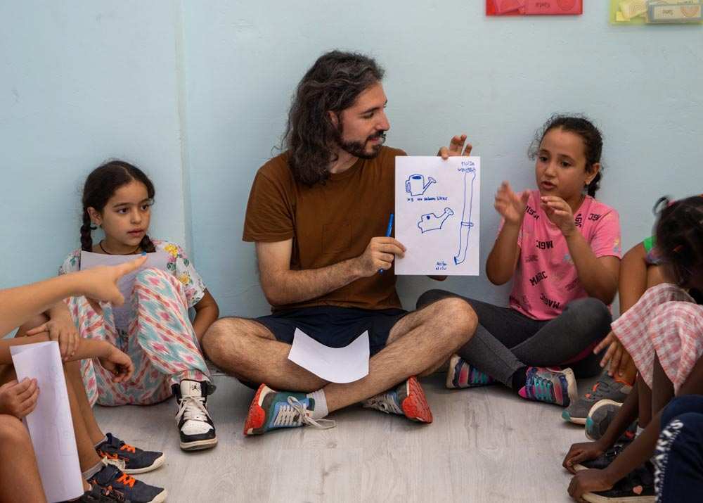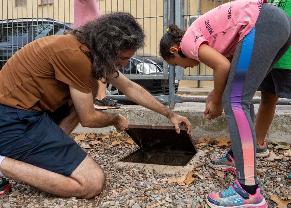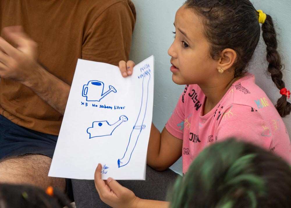 Durant el segon trimestre, el treball amb l’alumnat de segon de primària s’ha centrat a invocar la pluja a través del cant i de la performativitat per intentar fer ploure i, així, contribuir a augmentar el cabal del riu Ter. Finalment, amb l’alumnat de primer de primària, al llarg del tercer trimestre s’ha treballat a partir de la idea de ‘retornar l’aigua al riu’ —com a gest simbòlic i poètic—, recollint aigua de la pluja, construint una sèrie de recipients per contenir aigua i traslladant-la, fent una cadena humana, des de l’escola fins a la llera del riu Ter.