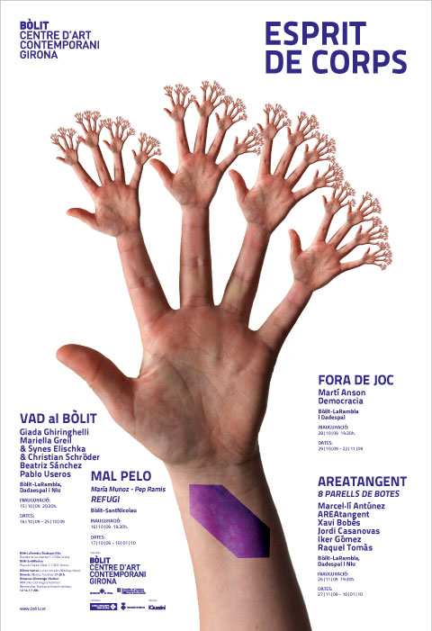 En tractar l' "esprit de corps" des de la pràctica, des del Bòlit hem volgut partir del propi territori gironí, atenent un context especialment ric i contundent en produccions i iniciatives experimentals a partir del cos, des de distintes disciplines i pràctiques artístiques. Esmentar el cos i la imatge en relació amb la creació a Girona, no és mai arbitrari ni casual; no en va és en territori gironí on es troben algunes de les iniciatives més sòlides des de disciplines com la dansa, el vídeo i la creació digital, com és el Festival VAD impulsat per Núria Font (Premi Nacional de Dansa 2009), o entorn de la recerca a través del cos com, des de Celrà, L'Animal a l'Esquena i la companyia Mal Pelo, el tàndem Maria Muñoz-Pep Ramis que enguany celebra vint anys d'existència. Pel que fa a l'impuls a creacions experimentals en relació amb les arts escèniques, no cal dir que el Festival Temporada Alta, amb Salvador Sunyer al seu capdavant, és un referent reconegut internacionalment. Partint doncs del propi context, són dues les propostes que parteixen de l'exploració del cos i la imatge des de la pràctica: la instal.lació Refugi (2009) de la companyia de dansa contemporània Mal Pelo i en una coproducció amb el Temporada Alta. Festival de Tardor de Catalunya - Girona/Salt, 8 parells de botes (2009), del col·lectiu teatral AREAtangent, amb la participació de Marcel·lí Antúnez, Xavi Bobés, Jordi Casanovas, Iker Gómez, Cristina Martín i Raquel Tomàs, entre d'altres.