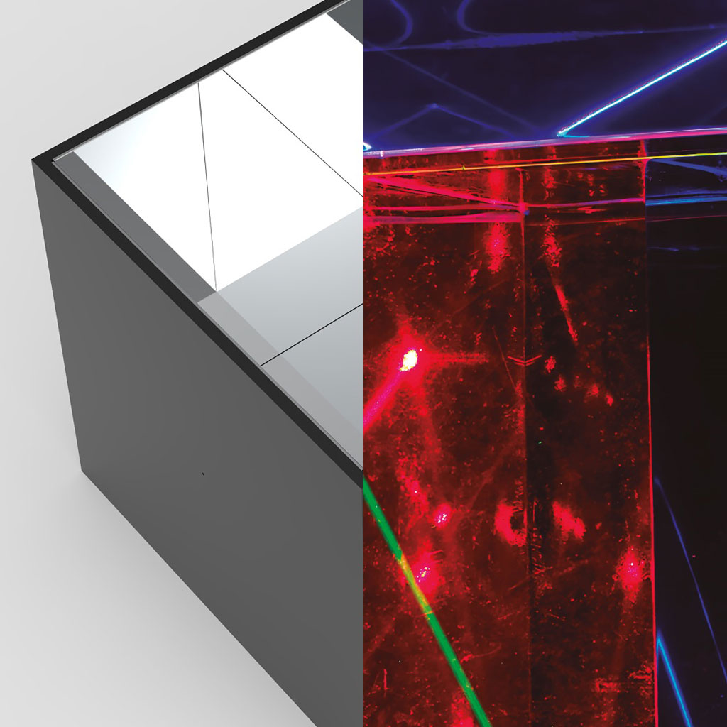 Cada artista formalitza el procés creatiu dins d'un cub: un ens convida a submergir-nos-hi, a ser testimonis d’un espai on les línies de pensament, exploració i ideació conflueixen en una nova realitat; l’altre ens manté a distància, requerint que confiem en la paraula de l’artista que, dins de la invisibilitat del cub, una xarxa de fotons en moviment teixeix la seva presència.