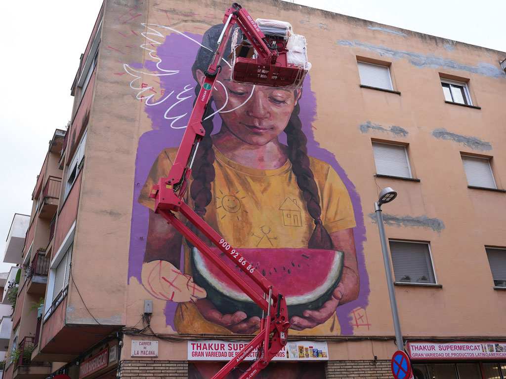 En el recorregut d’aquest matí, s’han vist algunes de les creacions que estan més avançades, com les que l’artista Irenx Remón (València) està pintant al número 7 del carrer Maçana, una de les de gran format que quedaran al barri de Santa Eugènia; la de l’artista Creto (Colòmbia/Madrid) al carrer del Puigneulós, que té un missatge social contundent i parla de la necessitat de generar barris lliures de racisme, o la de Rice (Barcelona/Londres), que fa referència a la importància de donar veu a les veïnes i als veïns dels barris i que està fent al carrer Sant Sebastià, en el que serà la creació amb les dimensions més grans del barri de Can Gibert del Pla. També s’ha pogut veure l’obra de Secta (Girona), que parla de la solitud no desitjada des d’una de les parets del Pavelló Municipal d’Esports Santa Eugènia-Montfalgars.