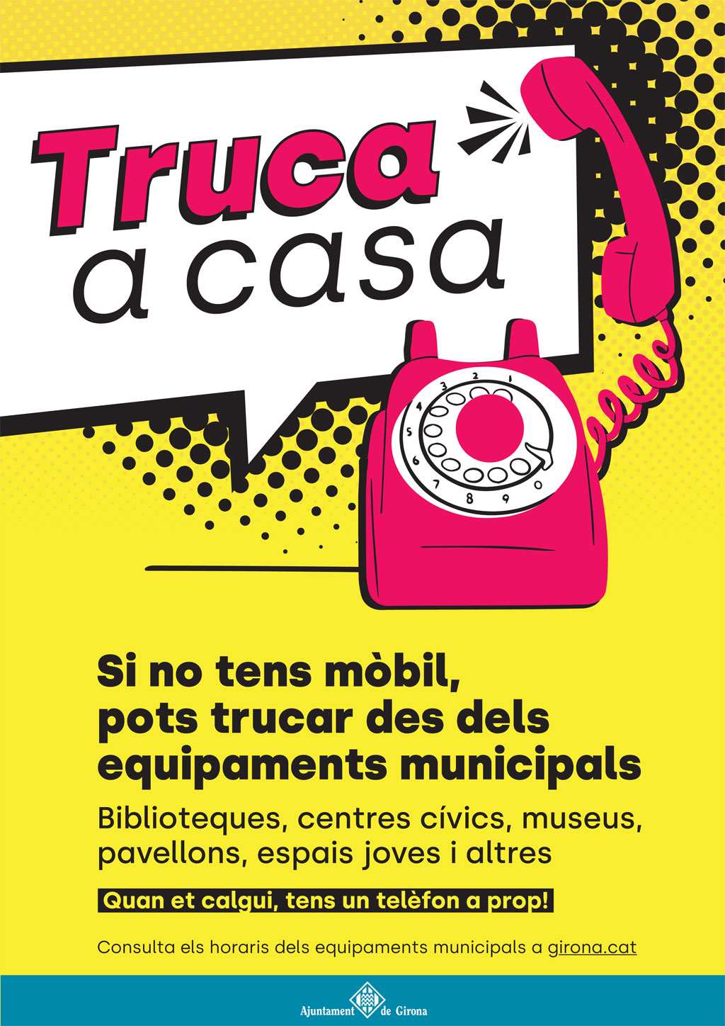 L’Ajuntament de Girona ha creat un nou servei pensat per donar resposta a una necessitat cada vegada més present: oferir el servei de trucada als infants i joves que encara no disposin de telèfon mòbil. Sota el lema de “Truca a casa”, es vol promoure i facilitar que aquests es puguin adreçar als equipaments municipals i utilitzar el telèfon fix d’aquests espais per comunicar-se amb la família. L’objectiu és garantir que tota la mainada de Girona sàpiga que les biblioteques, centres cívics, pavellons i altres equipaments esportius i culturals són espais amics, oberts i disposats a donar-los un cop de mà.