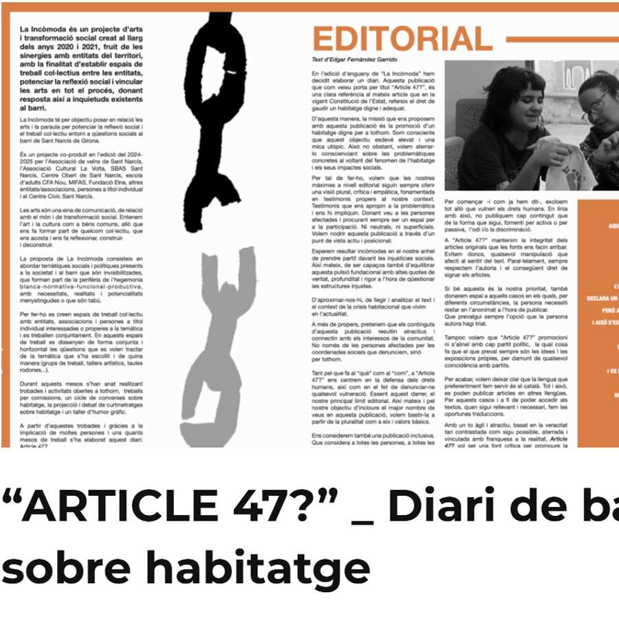 Aquest divendres 6 de juny, a les 18 h, al Centre Cívic de Sant Narcís es presenta la primera edició del Diari Article 47?, un mitjà creat col·lectivament al barri per reflexionar sobre la problemàtica de l’habitatge.