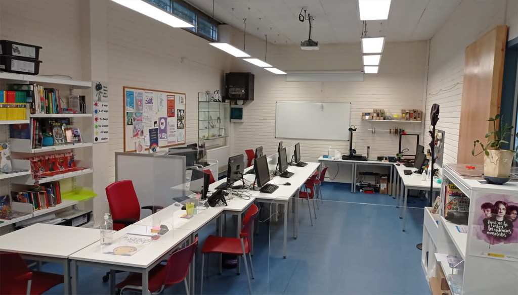 Sala amb capacitat per a 8-10 persones a la planta baixa. Aquest és un espai adequat per a desenvolupar activitats vinculades a les noves tecnologies, lectura i jocs. L’espai està equipat amb pantalla de projeccions, projector i ordinadors amb accés a internet. Actualment també ofereix espais més tecnològics, robòtica i disseny/impressió 3D.