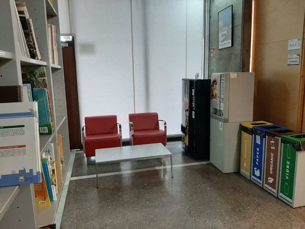 És l’espai d’acollida i on es troba la recepció del centre. Disposa de dues butaques, servei de premsa i màquines de cafè i begudes. Al mateix espai hi ha ubicat un punt d’intercanvi de llibres i taules amb ordinadors a disposició dels usuaris. Aquest espai també s’utilitza com a aula d’informàtica.