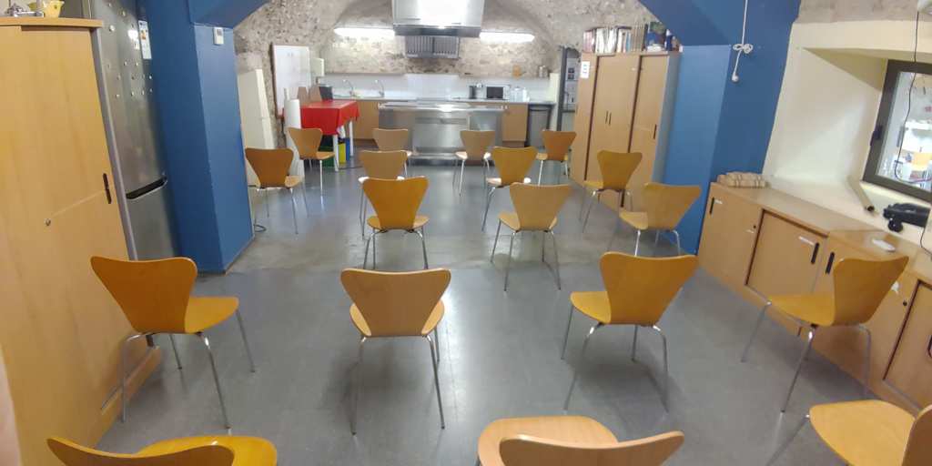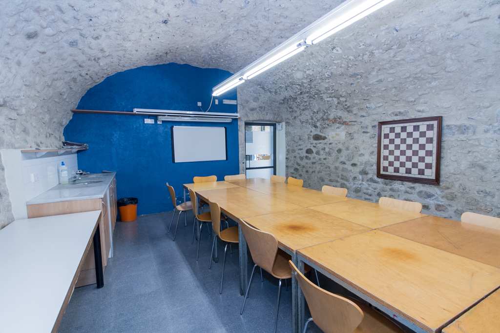 Ubicada a la planta baixa. Espai polivalent ideal per taller de treballs manuals i reunions de petit format. Disposa de pica amb aigua corrent, pantalla i projector.