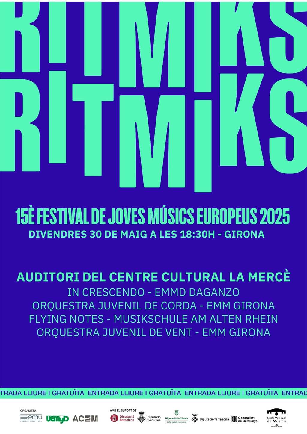 Girona és una de les seus de RITMIKS i el divendres 30 de maig a les 18.30 h acollirà concerts a l’auditori del Centre Cultural La Mercè. Les formacions que hi actuaran seran: Flying Notes, de la Musikschule Am Alten Rhein; In Crescendo, de l'EMM Daganzo, i Orquestres Juvenils de Vent i Corda de l'Escola Municipal de Música de Girona, amfitriona del RITMIKS a la ciutat.