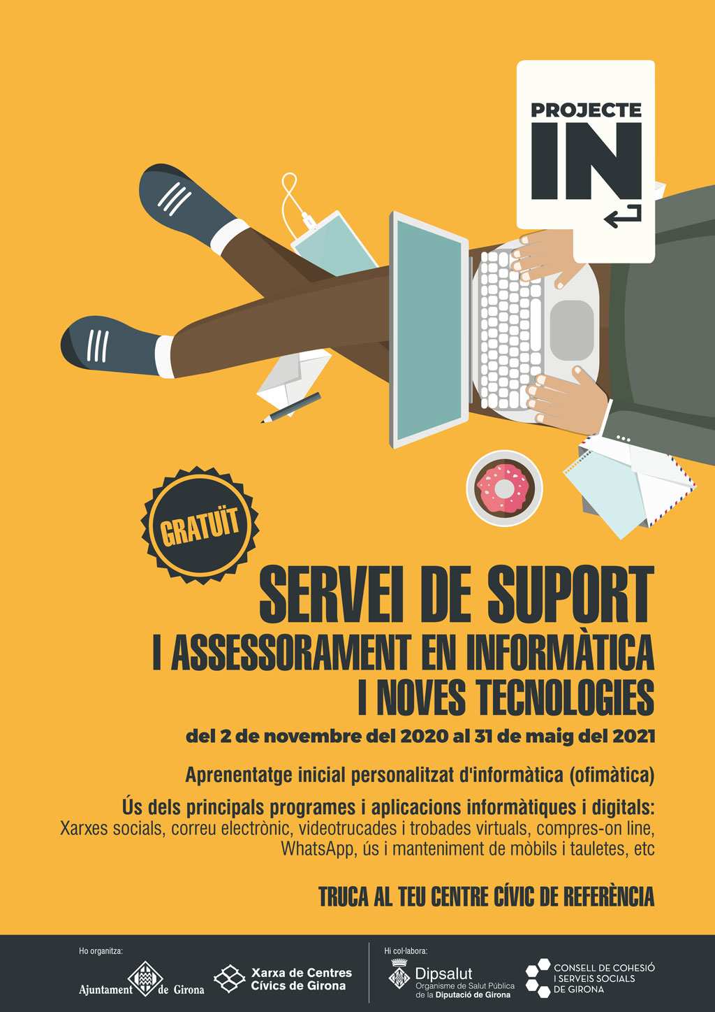 L’Ajuntament de Girona ha posat en marxa el projecte “IN” destinat a reduir la fractura digital, incrementada amb la pandèmia de la COVID-19. Es tracta d’un programa que inclou tres línies d’actuació: ampliar i millorar la infraestructura informàtica dels equipaments públics de proximitat, formar la ciutadania en l’ús de les noves tecnologies i aportar eines de suport a les persones per realitzar un tràmit telemàtic. L’objectiu d’aquest paquet d’actuacions és afavorir l’accés i la capacitació en eines TIC, a través de l’enfortiment comunitari per revertir aquesta desigualtat entre els col·lectius més afectats. Així ho han explicat aquest matí en roda de premsa l’alcaldessa de Girona, Marta Madrenas, i la regidora de Drets Socials de l’Ajuntament de Girona, Núria Pi.