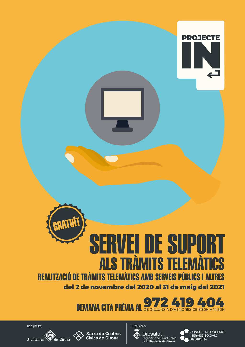 Per últim, s’ofereix un servei de suport al tràmit telemàtic per evitar la discriminació en l’accés a les prestacions, recursos i serveis de les administracions i altres. Des del novembre, s’està duent a terme un acompanyament i suport presencial, de forma gratuïta, per realitzar aquests tràmits digitals. Hi ha un punt de suport al tràmit a cada centre cívic, per tal de facilitar l’accés. Aquest servei estarà actiu fins al 31 de maig del 2021 i per accedir a ell s’ha de demanar cita prèvia trucant al 972 419 404 (de dilluns a divendres, de 8:30 h a 14:30 h).