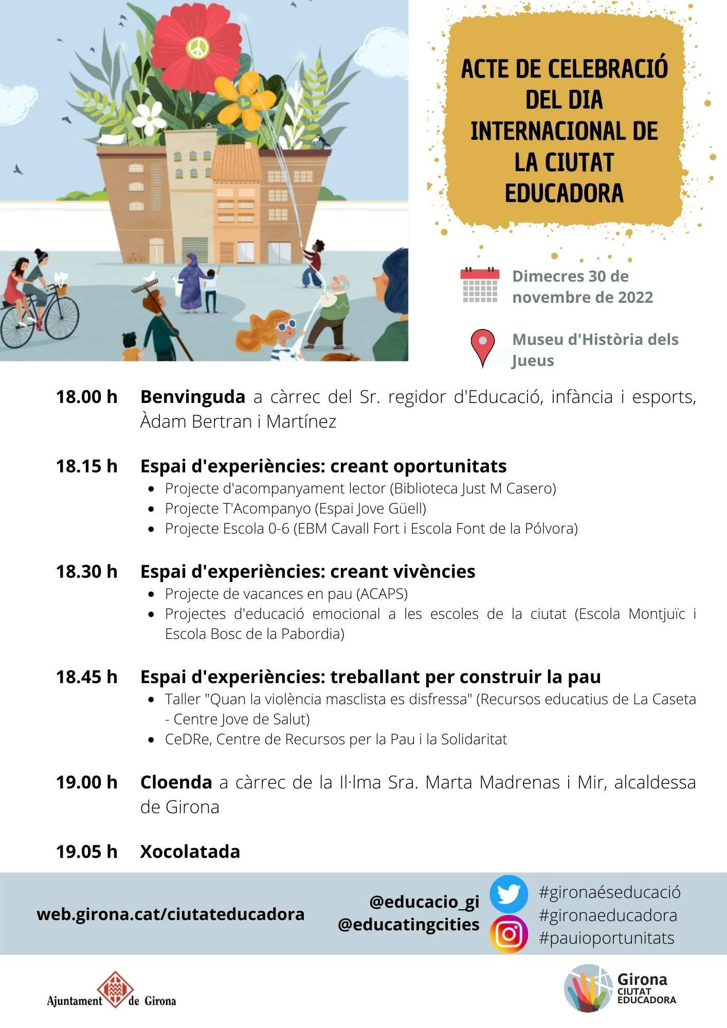 L’Ajuntament de Girona celebrarà el Dia Internacional de la Ciutat Educadora, que té lloc cada 30 de novembre, realçant els projectes de la ciutat que treballen per la pau i la generació d’oportunitats. Enguany, el lema de la jornada és “La ciutat educadora, ciutat de pau i oportunitats”, el qual serà treballat durant tot l’any des de diferents entitats, administracions públiques i ciutadania, per reforçar aquesta temàtica a la ciutat. El projecte de ciutat educadora és transversal i implica totes les àrees i serveis de l'Ajuntament però també tota la ciutadania, entitats i institucions.