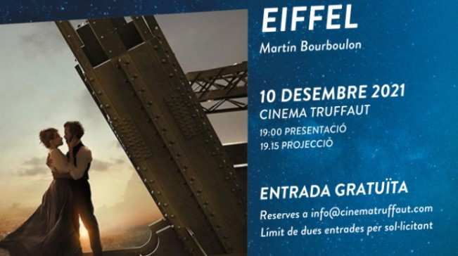 La “Nit del Cinema Europeu - Compartint històries que estimem” es durà a terme entre el 6 i el 10 de desembre de 2021 a més de 80 ciutats d’Europa i arribarà a més de 14.500 persones. Entre les sales escollides per dur a terme aquest esdeveniment hi ha el Cinema Truffaut, l’únic de tot Catalunya i un dels quatre seleccionats de l’Estat Espanyol. L’equipament municipal hi participarà amb la projecció, el proper divendres 10 de desembre a les 19 h, de la pel·lícula francesa Eiffel (Martin Bourboulon, 2021), en la qual es narra la vida i obra del genial enginyer Gustave Eiffel.