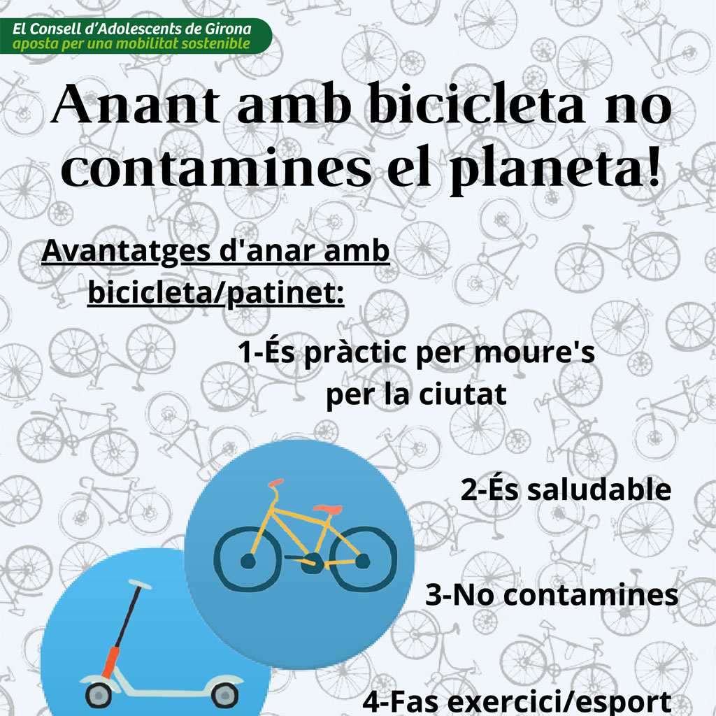 Els nois i noies de 1r d'ESO de l'Institut Jaume Vicens Vives han fet un cartell explicant els avantatges d'utilitzar la bicicleta o patinet com a mitjà de transport.