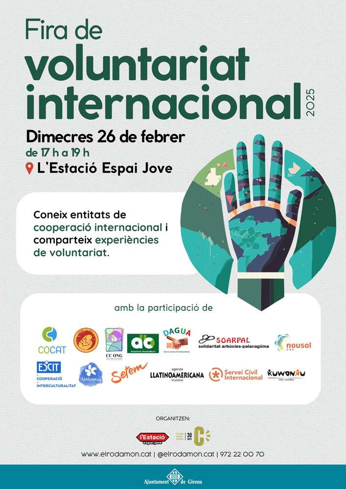 L’Estació Espai Jove acollirà aquest dimecres, dia 26 de febrer, de 17 a 19 h, la Fira de Voluntariat Internacional. L’objectiu de la jornada és que les persones joves puguin obtenir informació i resoldre dubtes directament amb les entitats que gestionen estades solidàries internacionals. Es tracta d’una iniciativa organitzada per l’Ajuntament de Girona en col·laboració amb la Coordinadora d’ONG Solidàries que arriba enguany a la sisena edició.