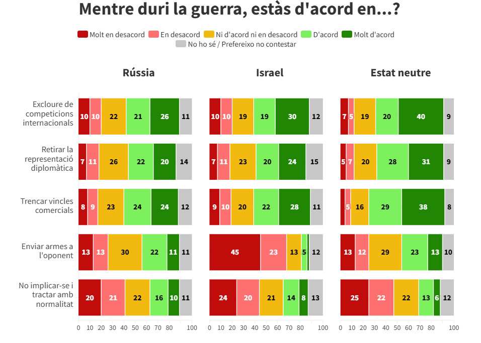 Alhora, pràcticament la meitat de la ciutadania també és partidària d'excloure Israel i Rússia de les competicions esportives i artístiques internacionals (un 48% i un 47%, respectivament), davant d'un 20% que s'hi mostra contrari, tant si es tracta de Rússia com d'Israel.