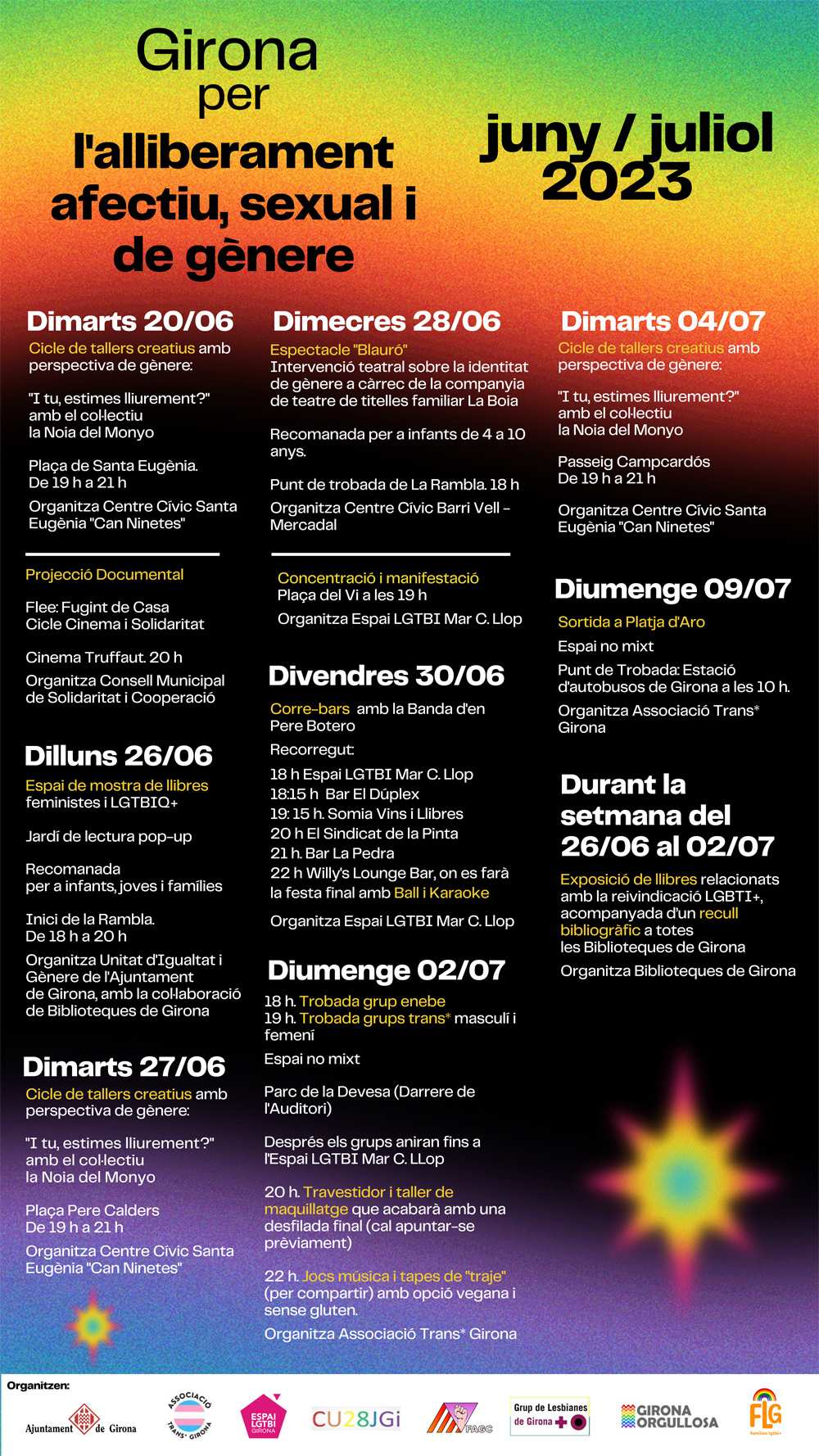 Fins al 9 de juliol, s’organitzaran una desena d’activitats més que inclouran tallers creatius amb perspectiva de gènere, una exposició de llibres, un espectacle teatral, un taller de maquillatge o trobades de grups enebe i trans. Amb aquesta programació, s’oferirà a la ciutadania un recull d’iniciatives per a totes les edats que tenen com a objectiu donar visibilitat al col·lectiu LGTBIQ+, sensibilitzar, qüestionar els prejudicis propis, trencar estigmes i seguir en la lluita per a la defensa dels drets de les persones del col·lectiu LGTBIQ+.