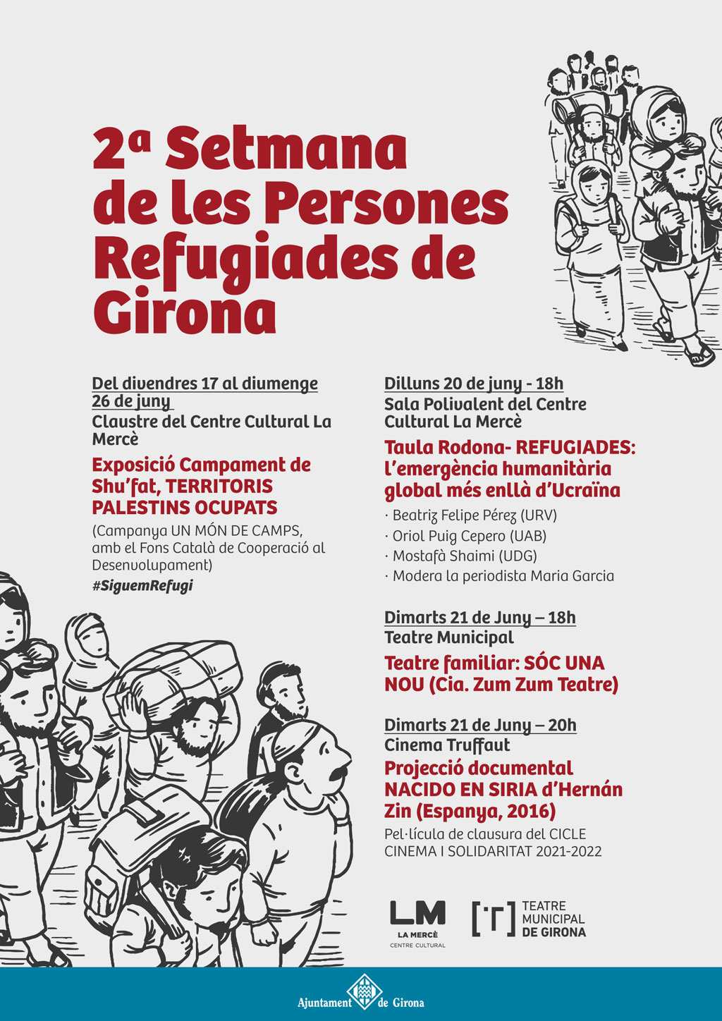 L'Ajuntament de Girona organitza, per segon any consecutiu, la Setmana de les Persones Refugiades. La iniciativa té com a objectiu apropar la realitat de les persones refugiades i sensibilitzar la ciutadania gironina més enllà dels estereotips i de l’origen d'aquestes persones., Enguany, es proposen diverses activitats que van des del teatre familiar fins al debat acadèmic i el cinema documental passant per una exposició fotogràfica.