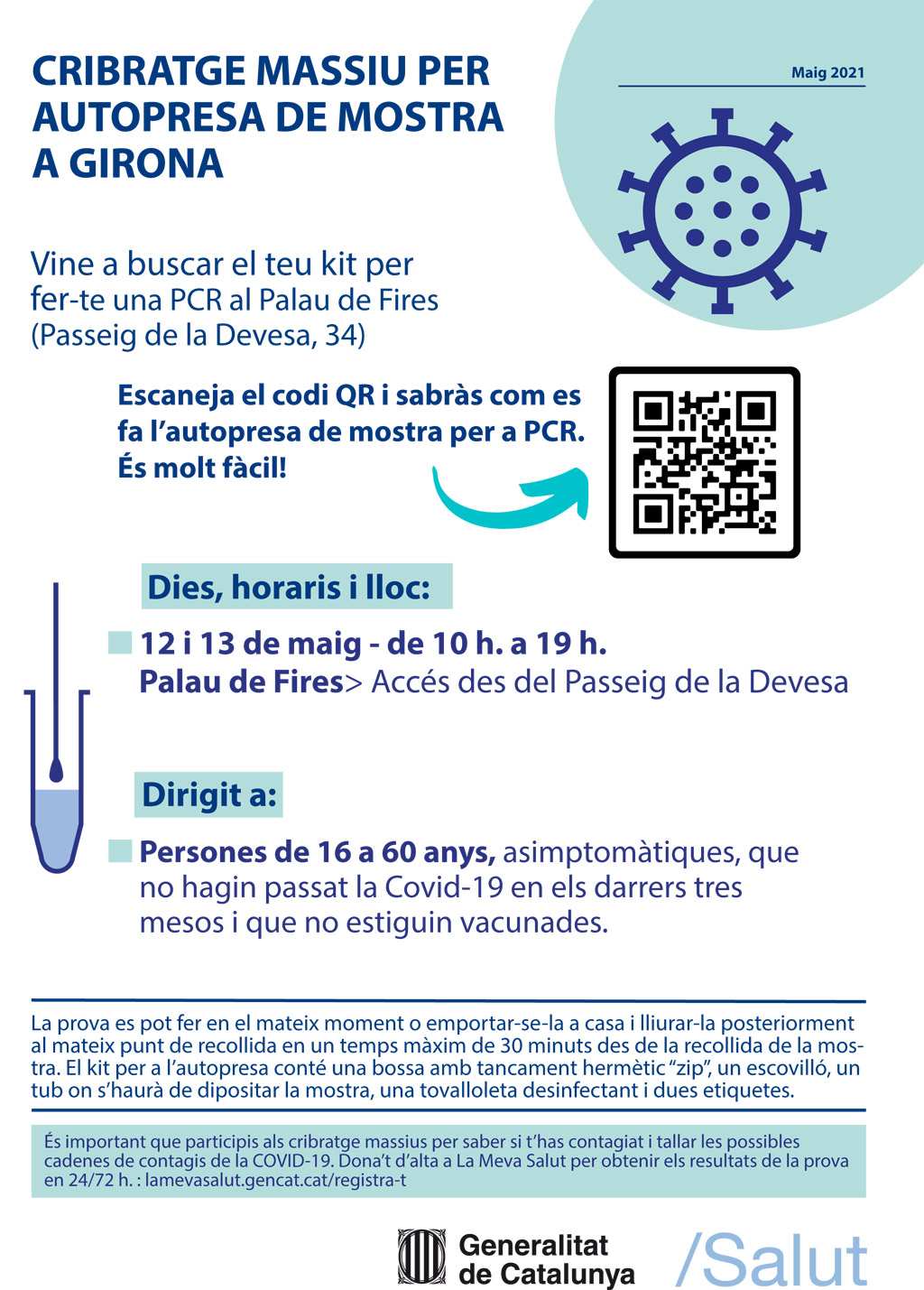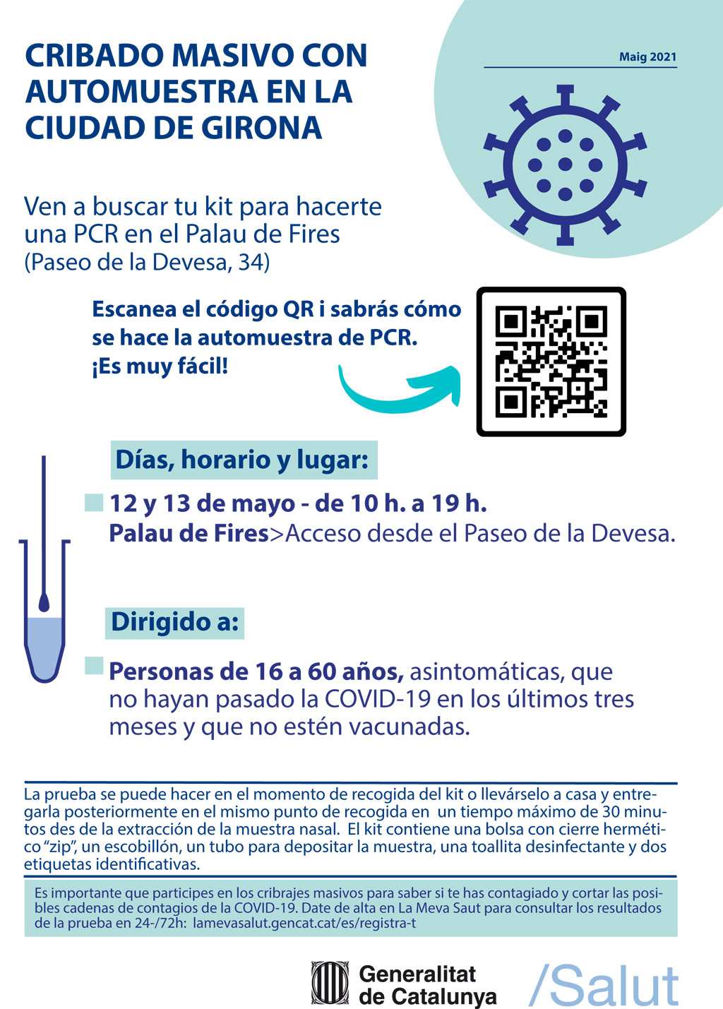 El segon cribratge amb automostra a Girona s’ha programat durant els dies 12 i 13 de maig, en horari continuat de 10 del matí a 7 de la tarda. En aquesta ocasió, i per tal de facilitar l’accessibilitat dels participants, es realitzarà al Palau de Fires, on també s’està desenvolupant la campanya de vacunació. L’acció es durà a terme en un espai diferenciat a l’interior del recinte i estarà correctament senyalitzat per tal de separar ambdós circuits. L’entrada al punt de cribratge es farà des del Passeig de la Devesa, mentre que les persones que s’hi desplacin per vacunar-se, ho hauran de seguir fent com fins ara, per l’accés habilitat al Passeig del Güell.