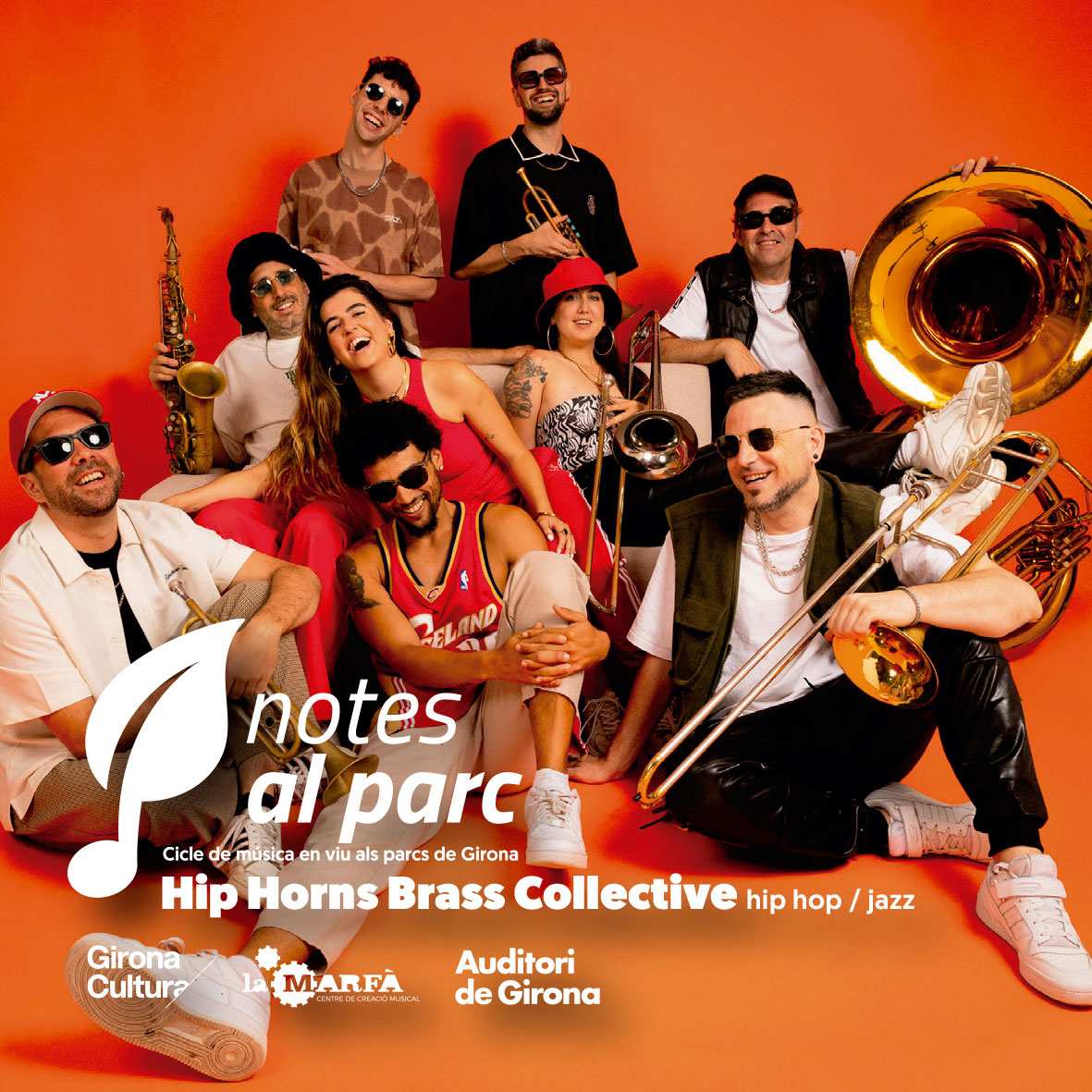 Units per la seva passió pel jazz i el hip-hop, Hip Horns Brass Collective és una brass band formada per músics catalans de generacions diferents que trenca els estereotips d'aquest gènere musical. Amb Krewe, el seu àlbum de debut, el grup fa el seu singular homenatge al jazz de Nova Orleans i s'endinsa en el món del hip-hop, amb influències del gòspel, el funk o l'R&B, sense renunciar al groove de qualitat. El concert d'aquesta banda inaugurarà aquest dimecres 9 de juliol la nova edició de "Notes al parc", al parc de Núria Terés i Bonet.