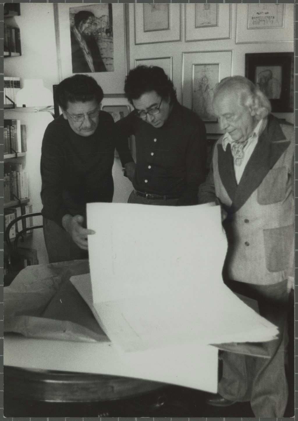16643: [Retornos de lo vivo lejano] 12/5/1977. Retrat de Rafael Santos Torroella, el pintor Antoni Tàpies i el poeta Rafael Alberti revisant les proves del llibre Retornos de lo vivo lejano, a casa del primer. Barcelona. Autoria: Roberto Otero.