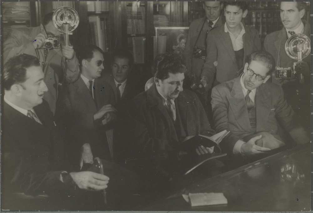 16896: [I Biennal Hispanoamericana d'art], 11/11/1951. Trobada de Salvador Dalí amb la premsa, al Instituto de Cultura Hispánica, amb motiu de la conferència Picasso y Yo, en el marc de la I Biennal Hispanoamericana d'Art. D'esquerra a dreta, l'artista, Rafael Santos Torroella i el polític Carlos Robles Piquer. Madrid. Autoria: Cristóbal Portillo.