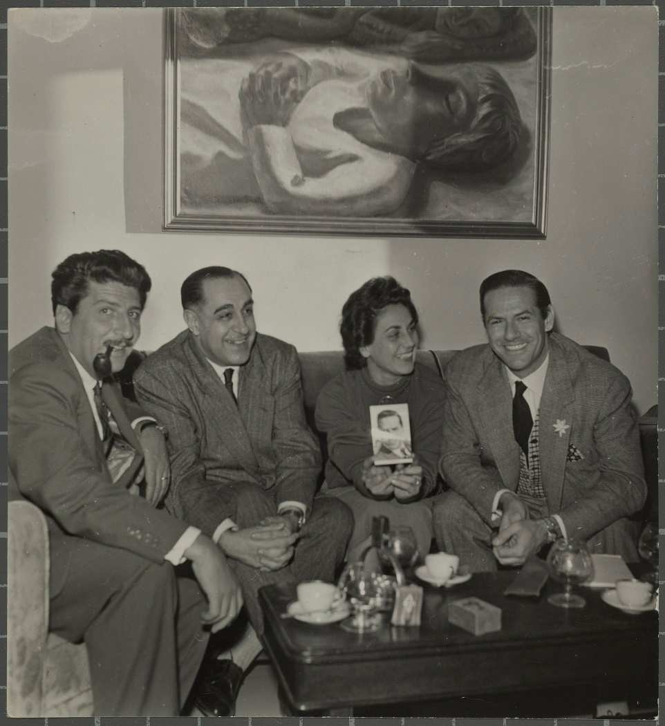 16958: [Visita a casa del matrimoni Santos Torroella], 1951. Visita a casa del matrimoni Santos Torroella. D'esquerra a dreta, Rafael Santos Torroella, el crític d'art José María Castro Calvo, María Teresa Bermejo i Mario Cabré a casa del matrimoni Santos Torroella. Al fons, el quadre de la Niña Muerta, obra d'Ángeles Santos Torroella. Barcelona. Autoria: Montserrat Garcia.