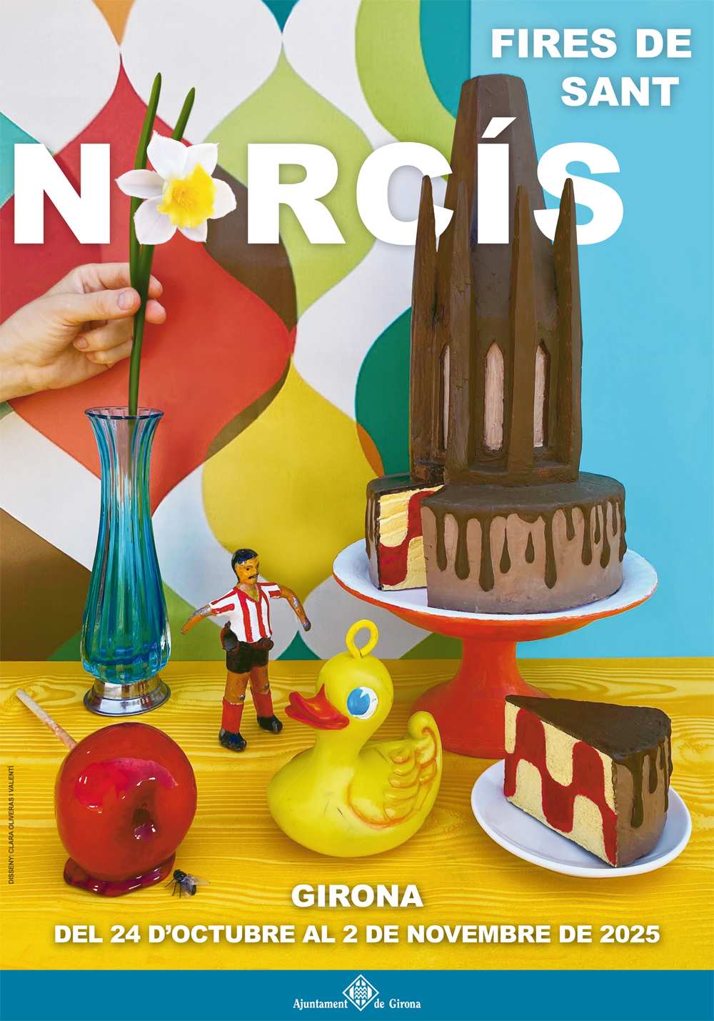 "Per fer el cartell vaig pensar en les primeres imatges i records que tenia de les fires quan era petita i va ser el dinar de celebració de Sant Narcís que fèiem amb la família, la safata de rebosteria plena de colors i els cavallets i la pesca dels ànecs", ha explicat l'autora de l'obra, Clara Oliveras, qui ha afegit que haver estat escollida ha estat "un honor".