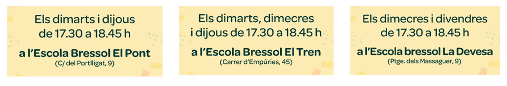 Per aconseguir-ho, posem a disposició de les famílies l’obertura d’equipaments municipals específicament dissenyats per l’atenció a la petita infància; concretament les escoles bressol fora de l’horari escolar, per tal de poder facilitar a les famílies amb infants d’entre 0 i 6 anys espais on poder jugar amb els seus fills i filles.