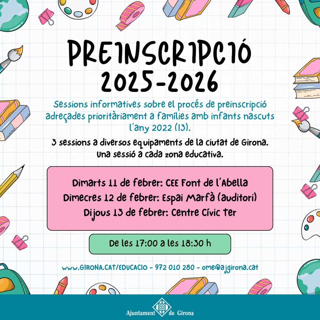 Des de l'Ajuntament de Girona s'han organitzat tres sessions informatives, una a cada zona educativa de la ciutat, adreçades prioritàriament a totes les famílies amb infants que han d'iniciar I3 el proper curs 2025-2026 (nascuts l'any 2022). Aquesta formació posa el focus en el procediment, la normativa, la importància de les jornades de portes obertes, el fet d'eliminar la rumorologia i la resolució de les incògnites respecte a l'ordre de prioritat d'accés, la baremació de les sol·licituds o la zonificació de la ciutat.