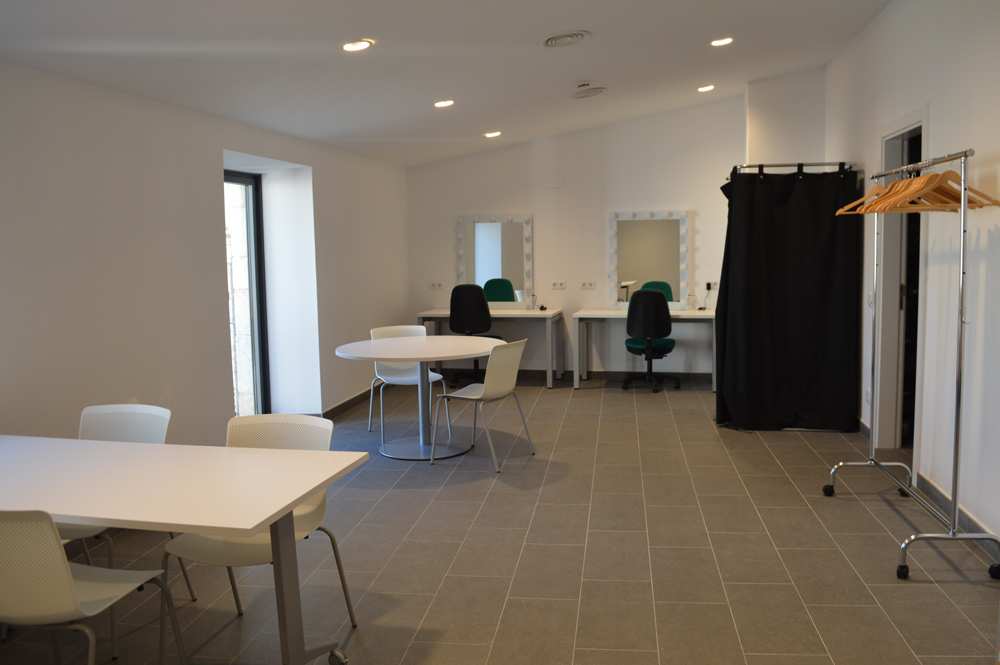 Espai versàtil equipat per ser utilitzat com a camerino o com a sala de reunions. Compta amb dos sets de maquillatge, un vestidor mòbil, una burra per penjar roba i dues taules amb cadires.