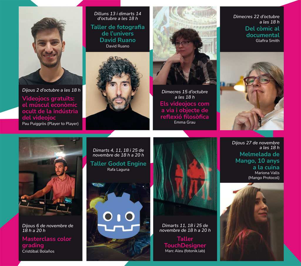 El mes de novembre començarà amb la masterclass de color grading a càrrec de Cristóbal Bolaños, que es farà dijous 6, adreçada a professionals de la imatge que vulguin aprofundir en tècniques actuals d’etalonatge per a cinema, sèries i animació. Els dimarts 4, 11, 18 i 25 de novembre es farà el taller de Godot Engine amb el desenvolupador i docent Rafa Laguna, que introduirà els participants en aquest motor de codi obert per a la creació de videojocs.