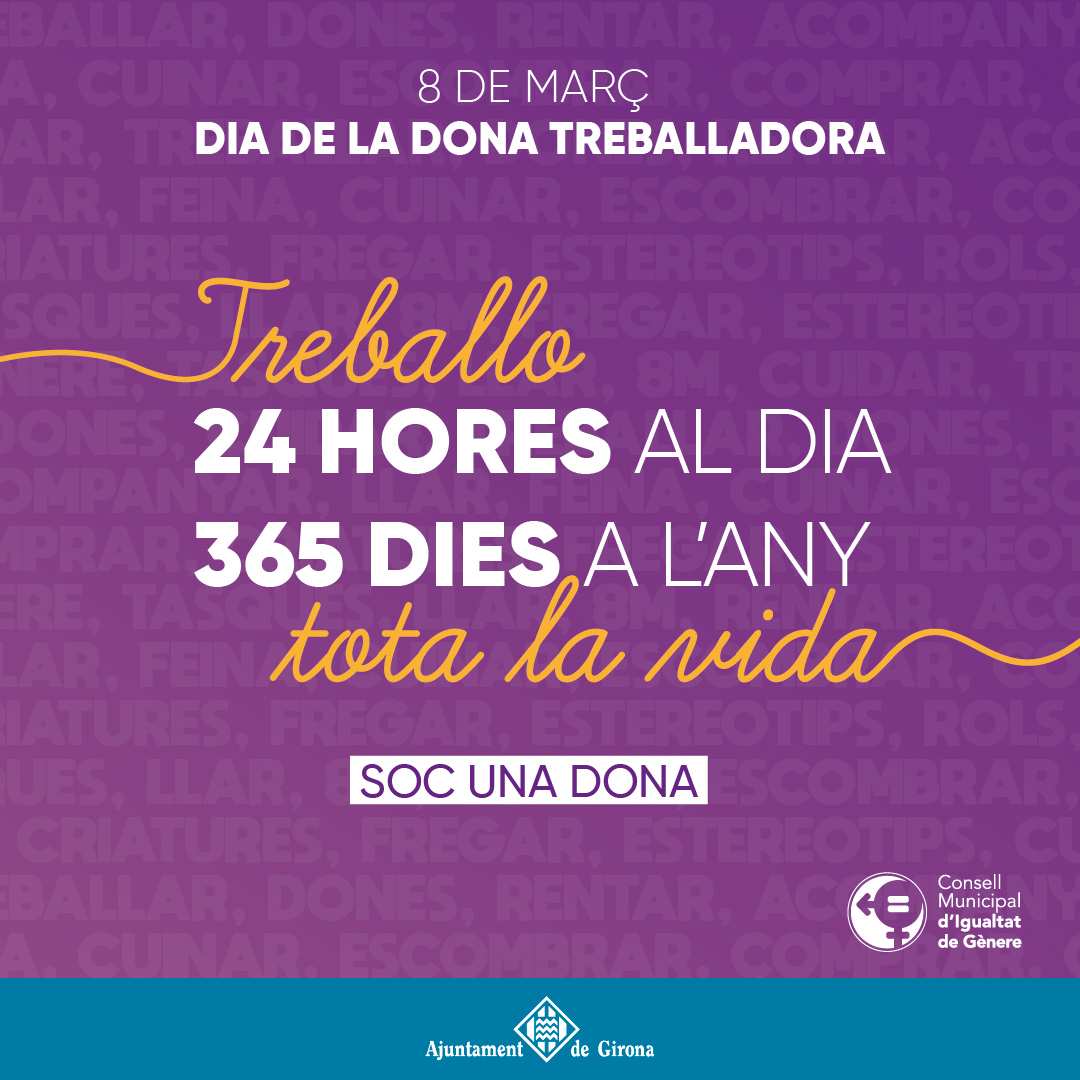L’Ajuntament de Girona, a través del Consell Municipal d’Igualtat de Gènere, ha engegat la campanya “Treballo 24 hores al dia, 365 dies a l’any, tota la vida. Soc una dona” amb motiu de la celebració del Dia de la Dona Treballadora, el 8 de març. La iniciativa gira al voltant de la divisió desigual de la feina per gèneres i la manca de reconeixement de les cures que, habitualment, recau sobre les dones. L’objectiu principal de la iniciativa és crear un ambient de reflexió sobre la separació existent socialment entre el treball productiu i el reproductiu.