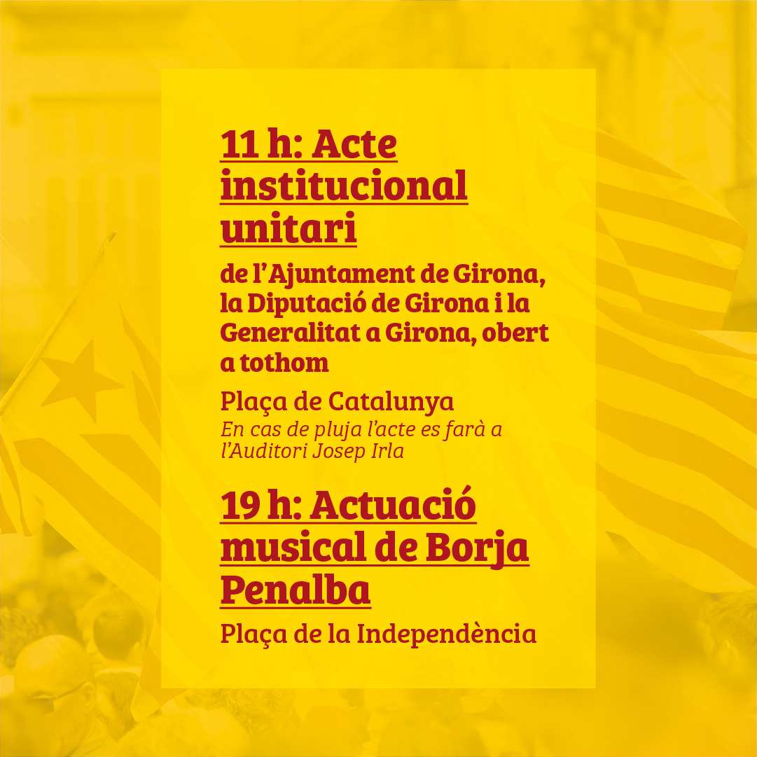 Seguint amb la voluntat iniciada l’any passat de fer de la Diada Nacional de Catalunya un dia amb activitats festives a la ciutat, des de l’Ajuntament de Girona s’ha organitzat un concert amb Borja Penalba el mateix dimecres 11 de setembre, a les 19 h, a la plaça de la Independència.