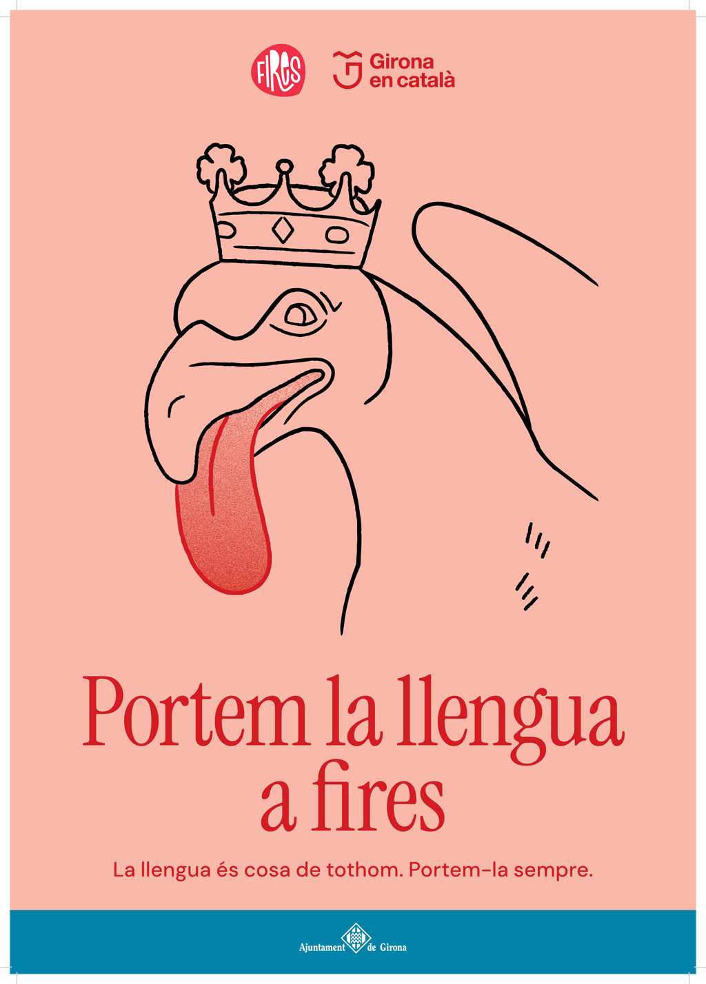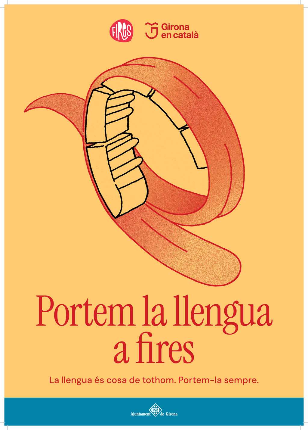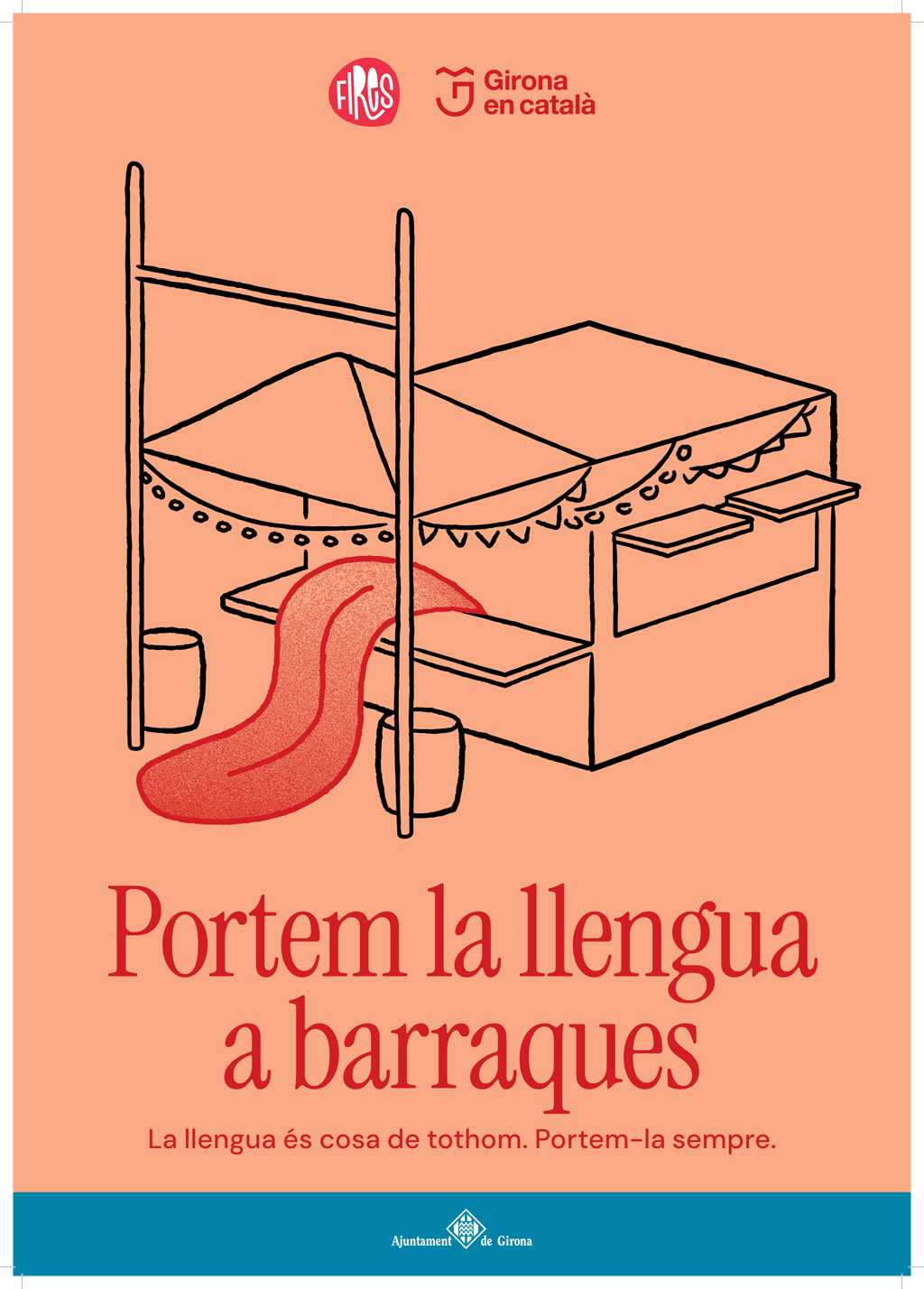 Aquesta iniciativa està adreçada a tota la ciutadania de Girona i dels municipis del voltant i vol impulsar l’ús del català utilitzant figures de l’imaginari col·lectiu de les Fires de Sant Narcís. Concretament, s’ha escollit un Diable de l’Onyar, l’Àliga de Girona, una atracció de fira en forma de bucle i una barraca de la Copa. Amb els eslògans “Portem la llengua a fires” i “Portem la llengua a barraques”, aquestes imatges volen evocar tant les tradicions com els espais més representatius de les Fires, la cultura popular i l’oci nocturn.