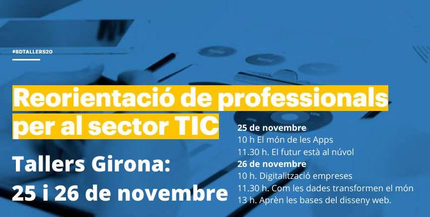 A continuació, els dies 25 i 26 de novembre entre les 10 i les 13 h, es realitzaran 5 tallers d'orientació dirigits a professionals, sense experiència digital, que vulguin fer un canvi a la seva carrera. L’objectiu és que coneguin quina és la professió digital que millor s’adapta a les seves competències i habilitats. Aquests són uns tallers d’orientació, en línia i gratuïts, específics per conèixer de primera mà els àmbits professionals digitals on actualment hi ha més demanda de professionals. Els participants aprendran com treballa una persona en l’àmbit web o en el desenvolupament d’aplicacions mòbil i coneixeran les eines d’un consultor en CRM & ERP, les particularitats de treballar en el núvol o per a què serveix el Big Data i les seves principals aplicacions, entre altres. Per participar en aquestes sessions online cal inscriure’s aquí.