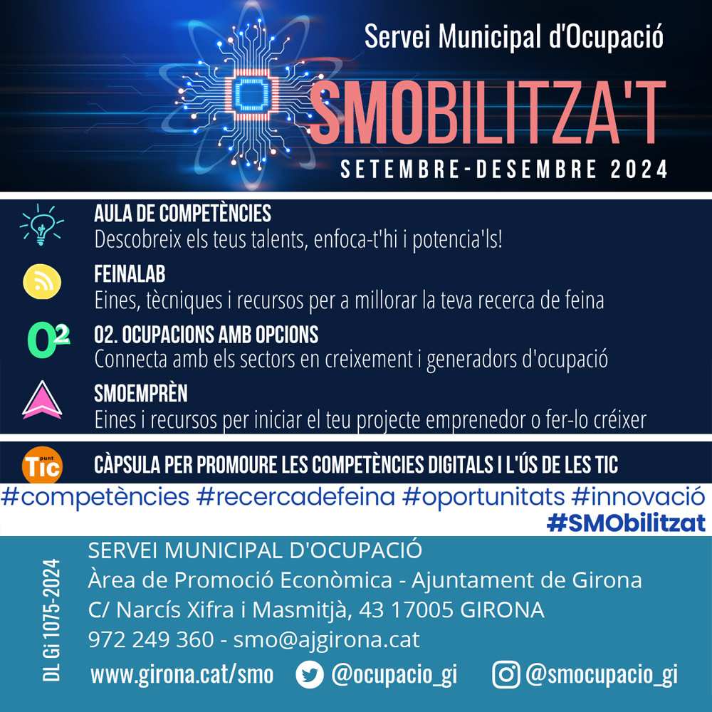 L’Ajuntament de Girona ha programat un total de 21 activitats gratuïtes per al darrer trimestre del 2024, entre setembre i desembre, amb l’objectiu de millorar l’ocupació laboral de la ciutadania. Es tracta del programa de capacitació laboral SMObilitza’t del Servei Municipal d’Ocupació (SMO), que busca oferir eines i recursos a la població per a la recerca de feina, promoure l’autoconeixement i la definició d’objectius laborals concrets i realistes, i oferir informació actualitzada dels principals sectors d’ocupació.
