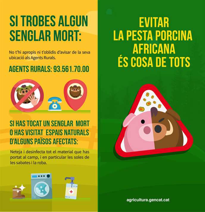 Davant la troballa de qualsevol senglar mort sense causa aparent o aparentment malalts, no els toqueu i aviseu ràpidament al Cos d’Agents Rurals (93 561 70 00) per a procedir a la seva recollida i a la investigació que correspongui.