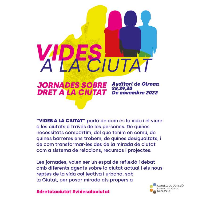 L’Ajuntament de Girona organitza els dies 28, 29 i 30 de novembre, al Palau de Congressos, “Vides a la ciutat”, un espai de reflexió i debat amb diferents agents sobre la ciutat actual, els nous reptes de la vida col·lectiva i urbana i el dret a la ciutat. L’objectiu és posar la mirada cap al futur de manera conjunta després de la pandèmia i dels seus efectes.