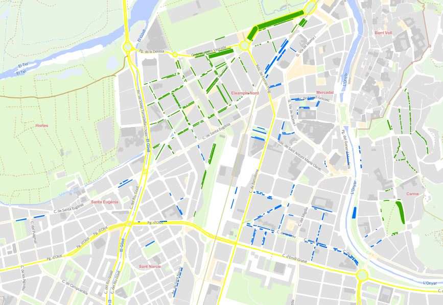 Plànol de l'àmbit de regulació de les zones verdes i les noves zones blaves a Girona: