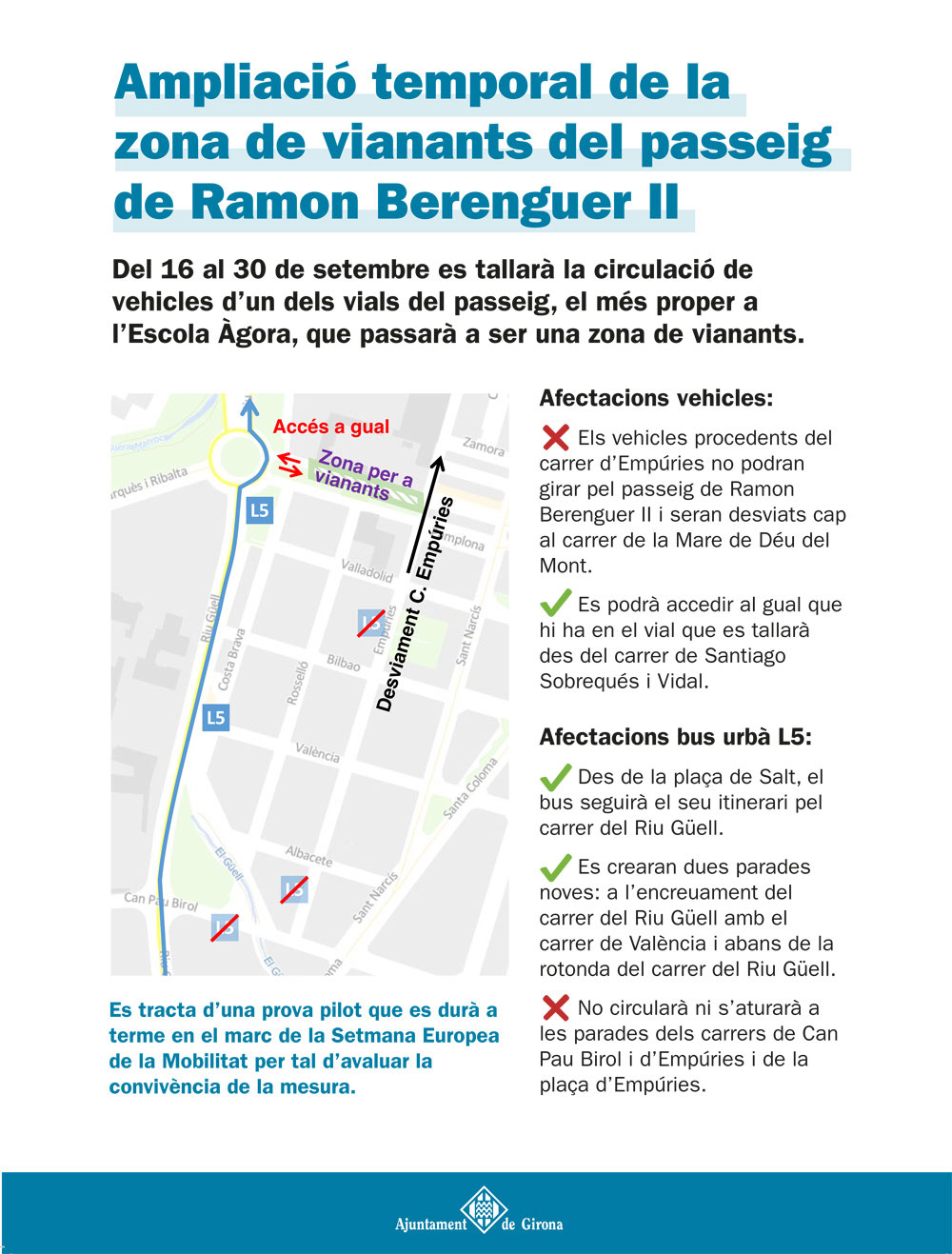 Del 16 al 30 de setembre es tallarà la circulació de vehicles d’un dels vials del passeig de Ramon Berenguer II, “Cap d’Estopes”; en concret, el més proper a l’Escola Àgora. Això permetrà comptar amb un entorn escolar més segur, saludable i jugable.