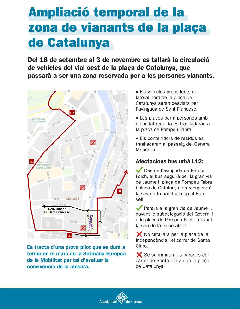 Durant un mes i mig, del 18 de setembre al 3 de novembre, es tallarà la circulació de vehicles del vial oest de la plaça de Catalunya, que passarà a ser una zona reservada per a les persones vianants. D’aquesta forma, es podrà accedir directament per la banda oest a la part central de la plaça d’una forma més amena i segura, ja que actualment s’han de creuar els passos de vianants. Cal tenir en compte que el sector de la plaça de Catalunya i de l’avinguda de Sant Francesc registra més de 12.000 desplaçaments diaris a peu.