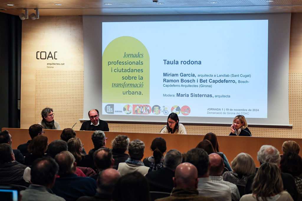 Durant la primera jornada, celebrada a la Demarcació de Girona del Col·legi d’Arquitectes de Catalunya (COAC), es va debatre sobre l’urbanisme regeneratiu i inclusiu amb l’arquitecta de Landlab (Sant Cugat), Míriam García, i dels arquitectes de Bosch-Capdeferro (Girona), Ramon Bosch i Bet Capdeferro. Els ponents van aprofundir en la visió estratègica necessària que ha de permetre actuar a diferents escales, però amb un horitzó clar i compartit. També van explicar que en el context actual, la sostenibilitat i la inclusivitat esdevenen eixos vertebradors de la transformació urbana. Gairebé 150 persones van seguir aquestes primeres ponències.