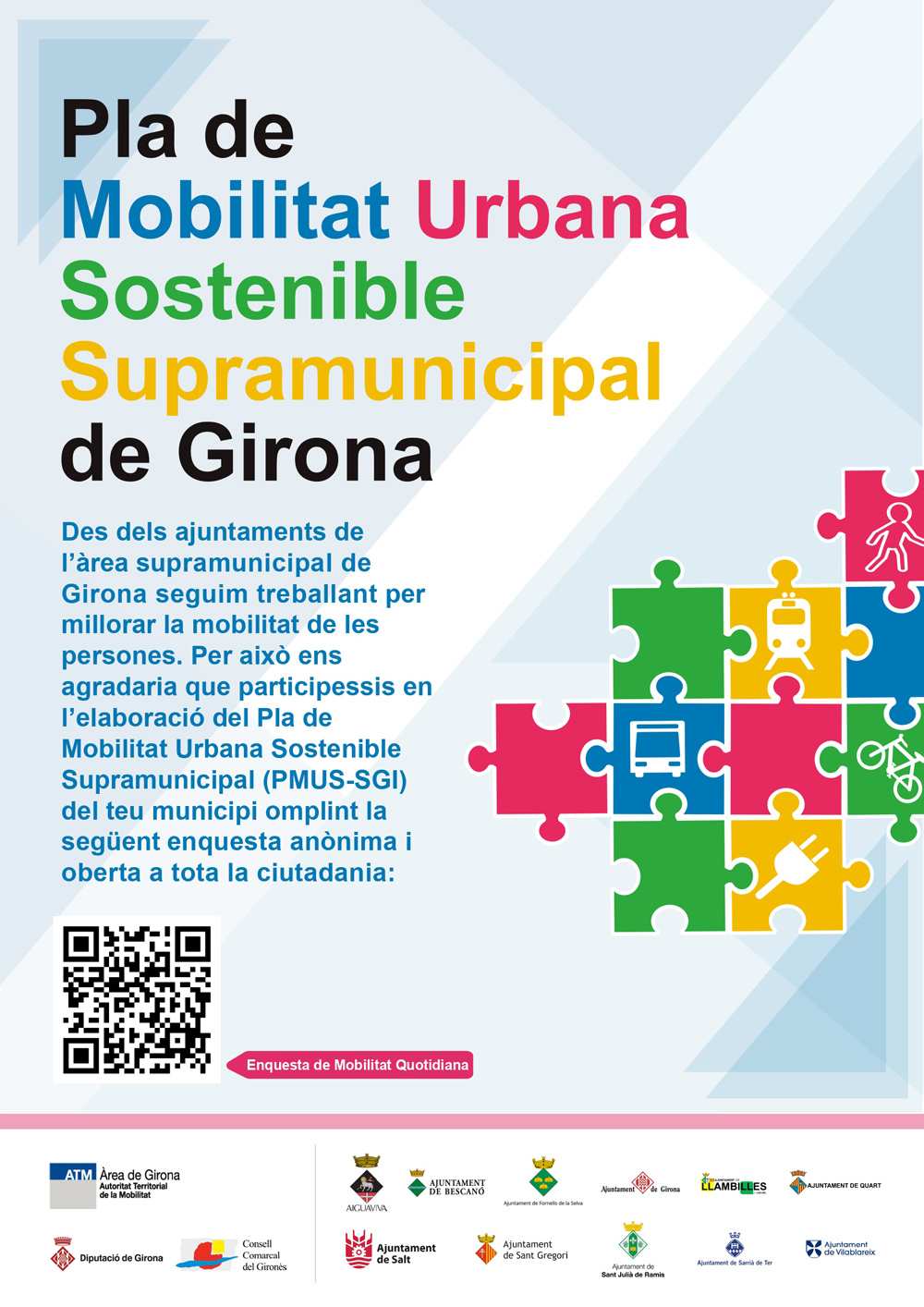 Des dels ajuntaments de l’àrea supramunicipal de Girona s’ha activat una enquesta en línia per tal de recollir els hàbits, les necessitats i les preferències de la ciutadania envers la mobilitat entre els respectius municipis. L’objectiu és millorar els desplaçaments a peu, en bicicleta, en patinet, en transport públic, en cotxe o en altres mitjans de transport entre Girona, Aiguaviva, Bescanó, Fornells de la Selva, Llambilles, Quart, Salt, Sant Gregori, Sant Julià de Ramis, Sarrià de Ter i Vilablareix, d’una forma més sostenible, segura, accessible i fàcil.
