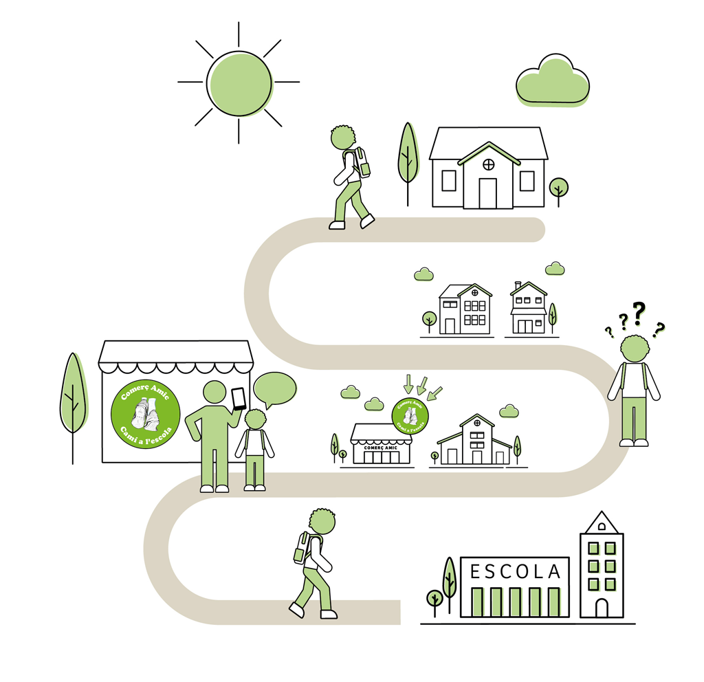En aquest camí diari a l’escola és necessària la col·laboració de diferents agents de la ciutat. Els comerços de la ciutat, per la ubicació, el nombre i per la seva actitud habitualment oberta, han de poder ajudar i vetllar perquè els infants facin els trajectes de casa a l'escola i de l'escola a casa amb seguretat.
