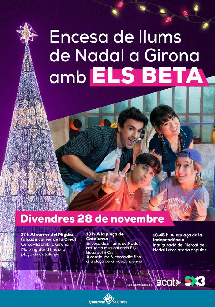 Els Beta de SX3 actuaran en l’encesa de les llums de Nadal de Girona el divendres 28 de novembre. Com és habitual, l’activitat començarà a les 17 ha amb una cercavila de la Girona Marxing Band que sortirà del carrer del Migdia i arribarà fins a la plaça de Catalunya, on hi haurà l’actuació musical i l’encesa de les llums.