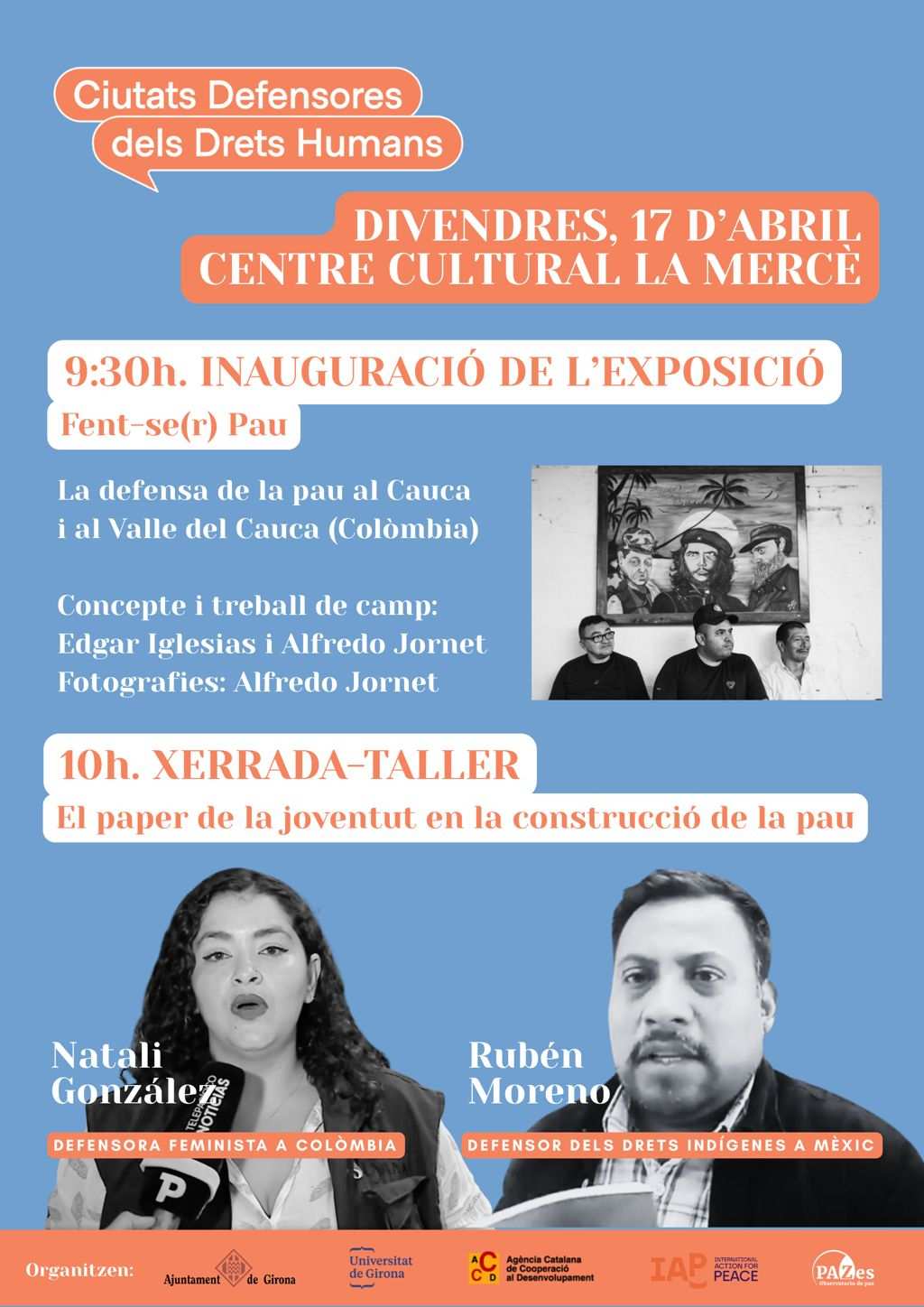 La colombiana Natali González Arce i el mexicà Rubén Moreno seran els protagonistes a Girona de la gira de primavera del projecte Ciutats Defensores dels Drets Humans. Aquest divendres, dia 17 d’abril, la ciutat acollirà una xerrada-taller sobre quin paper pot tenir la joventut en la construcció de pau, adreçada a alumnes universitaris i de batxillerat i organitzada en col·laboració amb la Xarxa d’Innovació Docent en Sostenibilitat, Pau i Drets Humans de la Universitat de Girona (UdG).