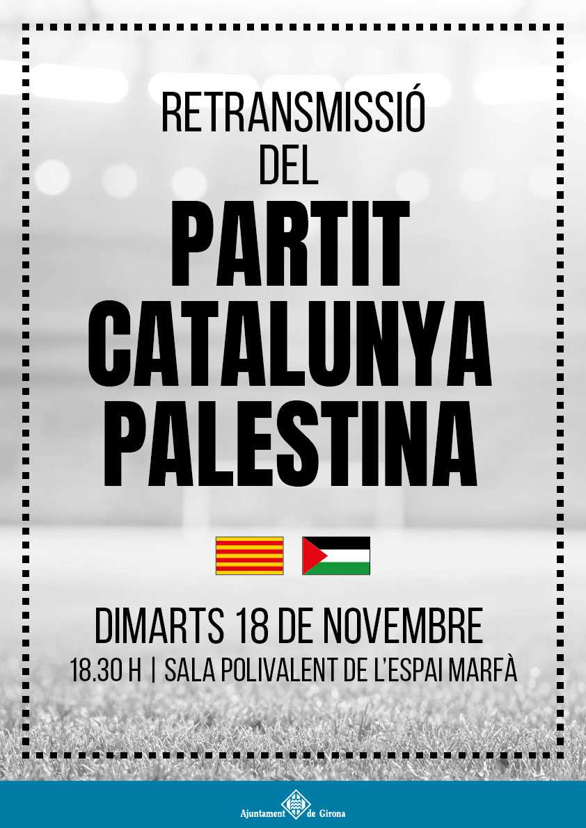 L’Ajuntament de Girona habilitarà la sala annexa de l’Espai Marfà per veure en directe el partit de futbol entre les seleccions de Catalunya i Palestina que es jugarà dimarts que ve, dia 18 de novembre, a les 18.30 h, a l’Estadi Olímpic Lluís Companys. Es tracta d’un partit benèfic, en què tota la recaptació es destinarà a donar resposta a les necessitats del poble palestí.