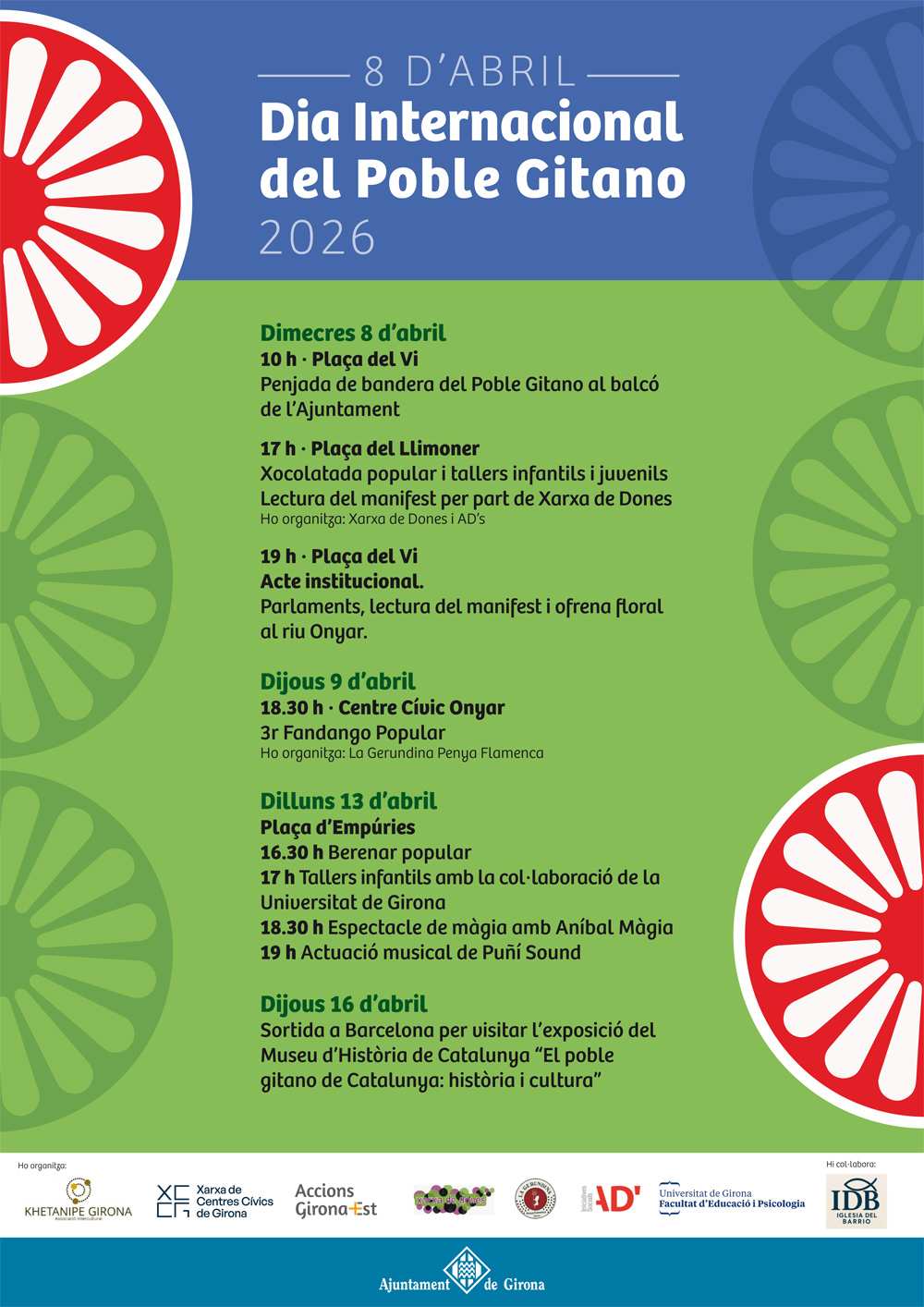 Girona celebrarà un any més el Dia Internacional del Poble Gitano, que té lloc anualment el 8 d'abril, amb diferents activitats organitzades pel consistori i per entitats i associacions de Girona Est entre el 8 i el 16 d'abril. L'objectiu d'aquestes propostes és donar a conèixer i celebrar tot allò que envolta la cultura gitana.