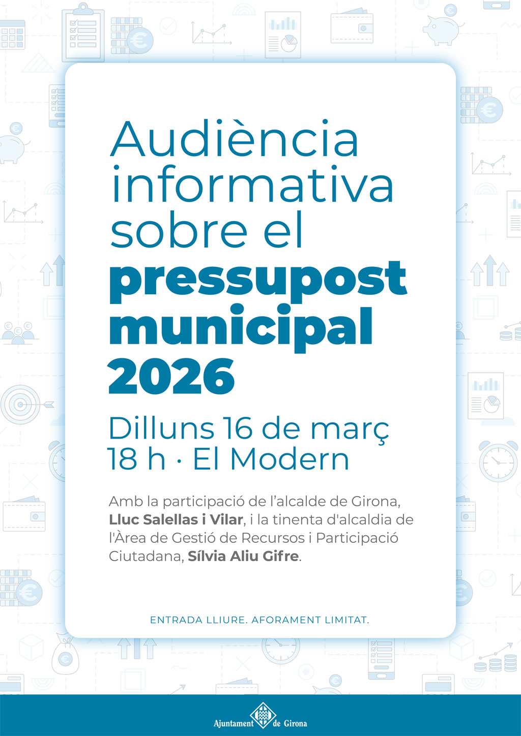 L’Ajuntament de Girona celebrarà el proper dilluns 16 de març, a les 18 h, una audiència informativa oberta a la ciutadania per presentar i explicar el pressupost municipal per a l’any 2026. L’acte tindrà lloc a El Modern i serà d’entrada lliure fins a completar l’aforament.