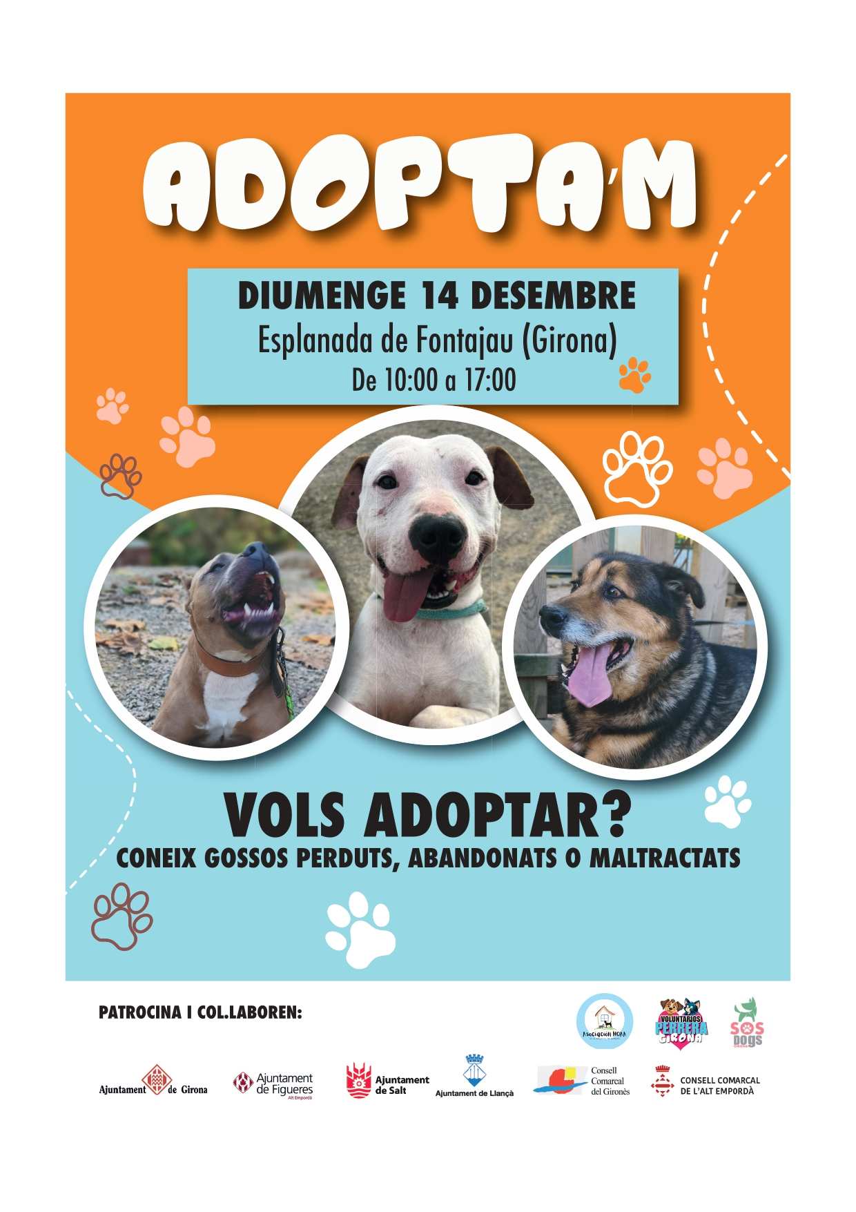 Durant la jornada, s'habilitarà un espai obert a la ciutadania al costat de la riera de Bullidors, on es presentaran alguns dels gossos que estan preparats per ser adoptats, provinents de la Residència Canina La Devesa de Girona. Els animals seran acompanyats, en tot moment, per diversos voluntaris i voluntàries del centre i de l'associació i es permetrà que les persones visitants els puguin conèixer, passejar breument amb ells i obtenir informació sobre el procés d'adopció.