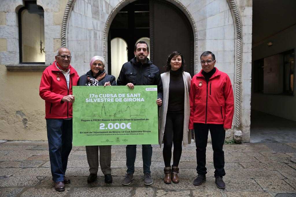 El regidor d’Educació, Infància i Esports de l’Ajuntament de Girona, Àdam Bertran, acompanyat de la presidenta del Club Atletisme Girona, Marti Valverde, i dels membres de la Junta del Club Atletisme Girona Toni Bautista i Xicu Espigulé, ha lliurat aquest migdia la recaptació solidària de la darrera edició de la Cursa de Sant Silvestre a la vicepresidenta de la Federació Catalana d’Entitats contra el Càncer (FECEC), Lluïsa Ferrer. La cursa està coorganitzada per l’Ajuntament de Girona i el Club Atletisme Girona.